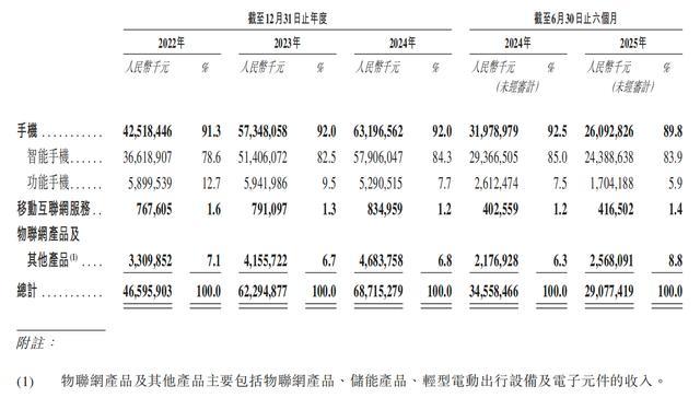 2022年至今年上半年,手机类产品(包括智能手机和功能手机)的营收占比均超过89%,为其主要收入来源,其中,功能手机业务带来的营收占比正在逐年下降。报告期间,传音控股按产品类型划分的收入情况如下: