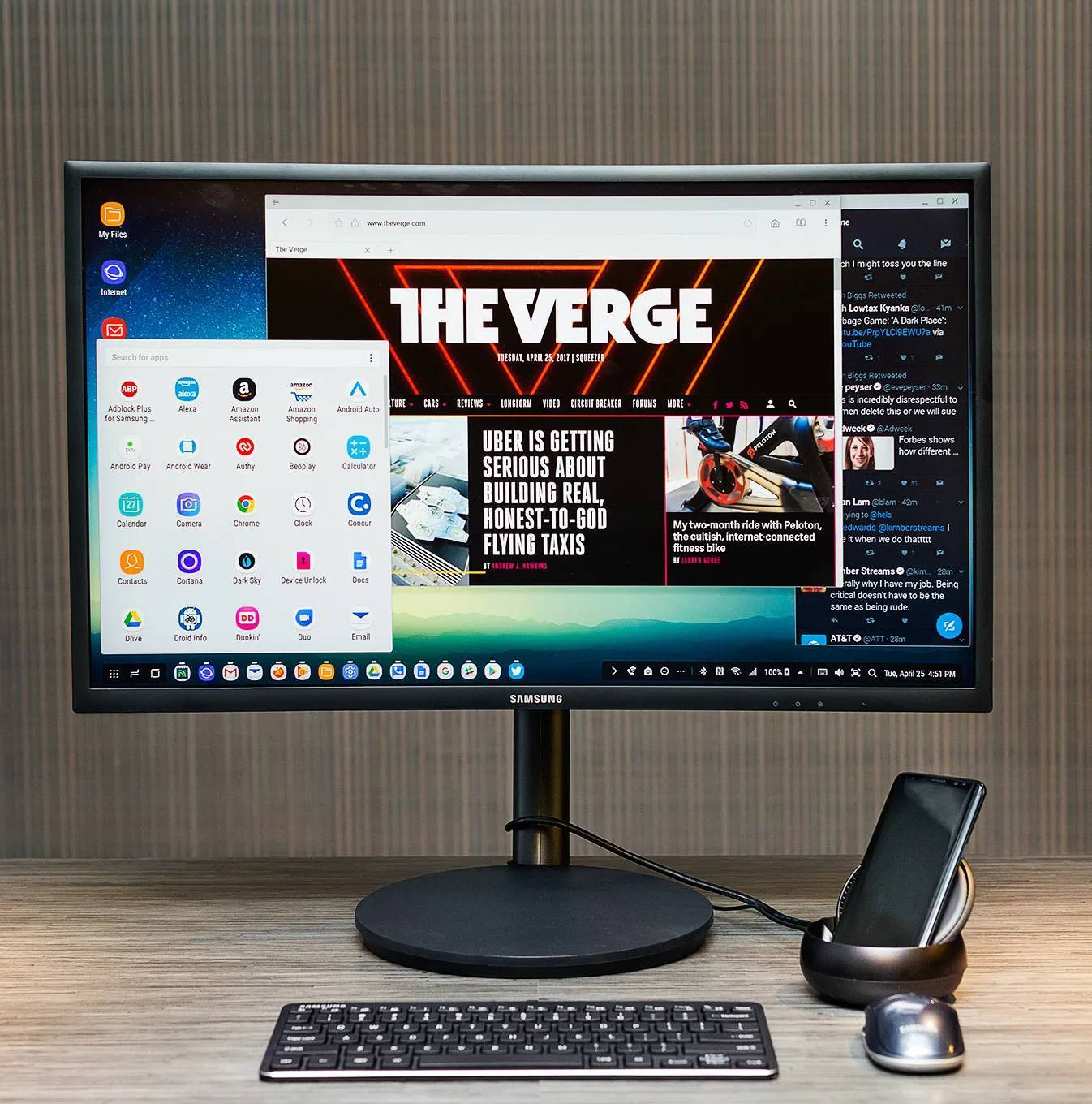 如果你以前用过三星,那么或许对会 DeX 这个名字有点印象,它是三星从 Galaxy Note 9 开始推出的一个「桌面模式」,让手机在外接显示器的时候能够以一种类 PC 的布局去操作,以弥补 Android 残缺的投屏体验: