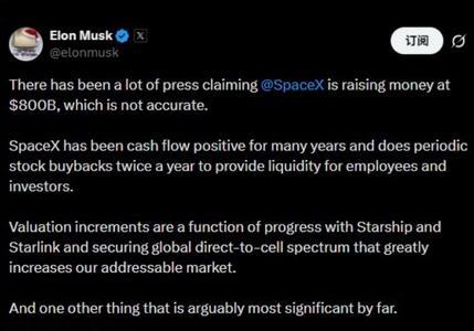 马斯克在其社交平台X发文称:“SpaceX多年来现金流持续为正,每年定期进行两次股票回购,为员工和投资者提供流动性。”