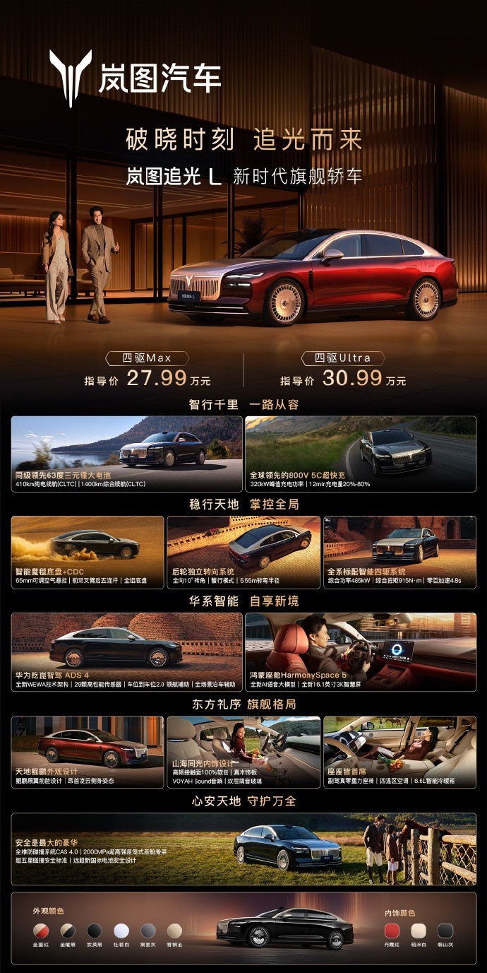 凤凰网科技讯 12月10日,岚图追光L豪华轿车正式上市。新车提供四驱Max版、四驱Ultra版两个版本,官方售价区为27.99万元、30.99万元。