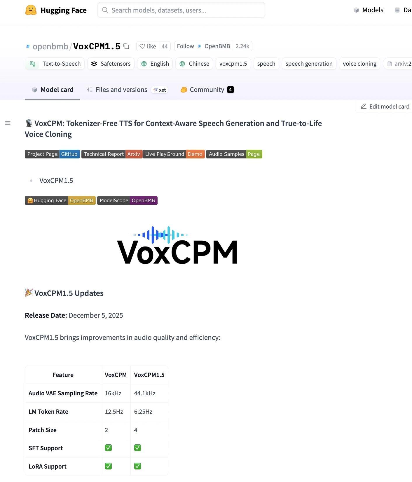 面壁智能VoxCPM 1.5上线并开源:高采样音频克隆,生成效率翻倍 凤凰网科技讯 12月10日,面壁智能宣布,VoxCPM 1.5版本正式上线并开源,多项核心能力升级。 其中,AudioVAE采样率从16kHz提升至44.1kHz,模型可根据高质量音频,克隆效果更佳、细节更丰富的声音;此外,VoxCPM 1.5仅需6.25个token即可生成1秒音频,较此前版本提高一倍,在保持速度的同时提升了音频生成质量。同时,VoxCPM 1.5版本稳定性增强,减少音频伪影,优化长文本音频的生成效果。 Published by 风君子 独自遨游何稽首 揭天掀地慰生平 View all posts by 风君子
