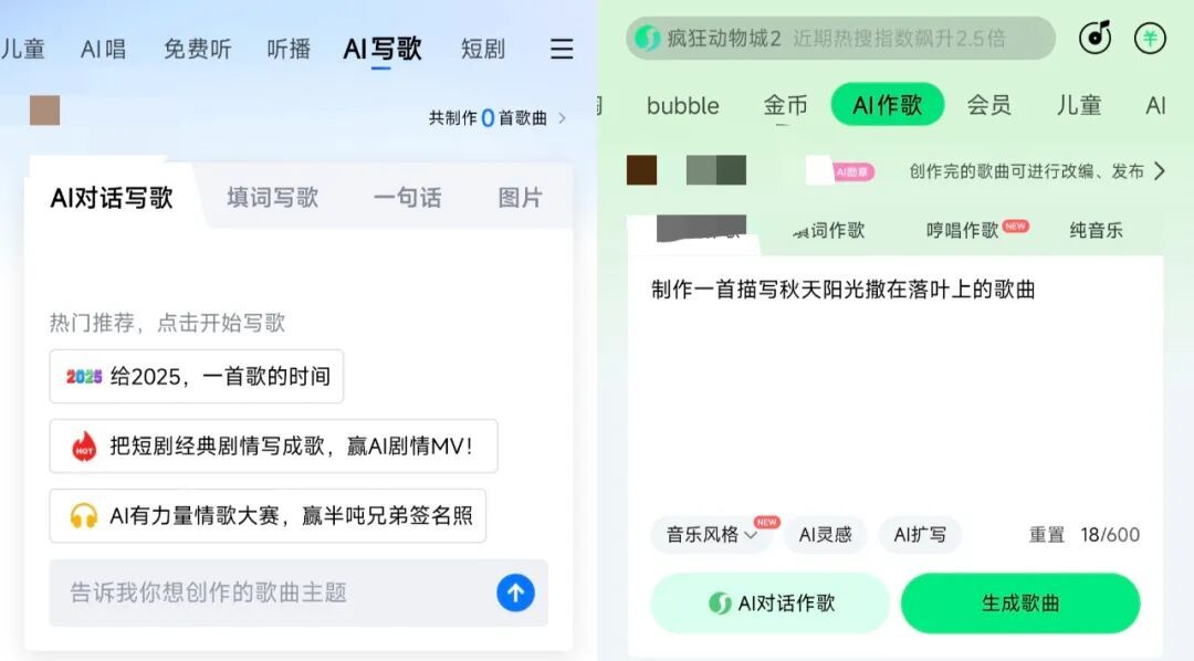 对于普通大众来说,AI音乐的生产力进化更直观地体现在流媒体平台的AI功能“上新”上。在网易云音乐等主流流媒体平台,有为AI歌曲建立的音乐专区。而打开QQ音乐、酷狗音乐,只需要轻轻滑动顶部菜单栏就能轻松找到“AI写歌”“AI唱”功能。