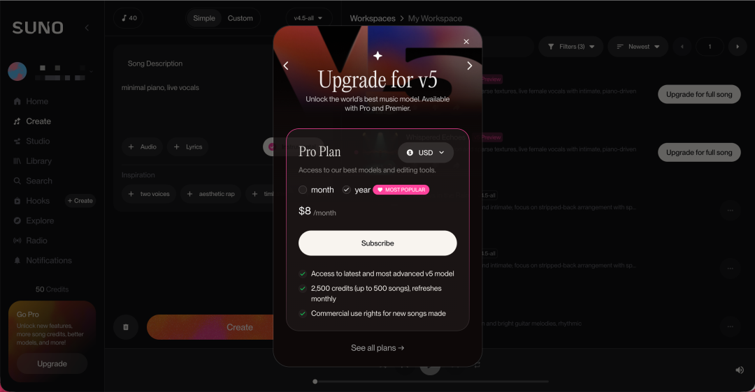 例如在QQ音乐、酷狗音乐,用户最低支付10元可获得2首AI歌曲,相当于每首歌的制作成本为5元。而在Suno平台,除了免费使用的模型外,专业版包年会员的单月价格为每月8美元,至多可以生成500首歌曲,相当于每生成一首歌只需要支付0.016美元(0.11元人民币)。