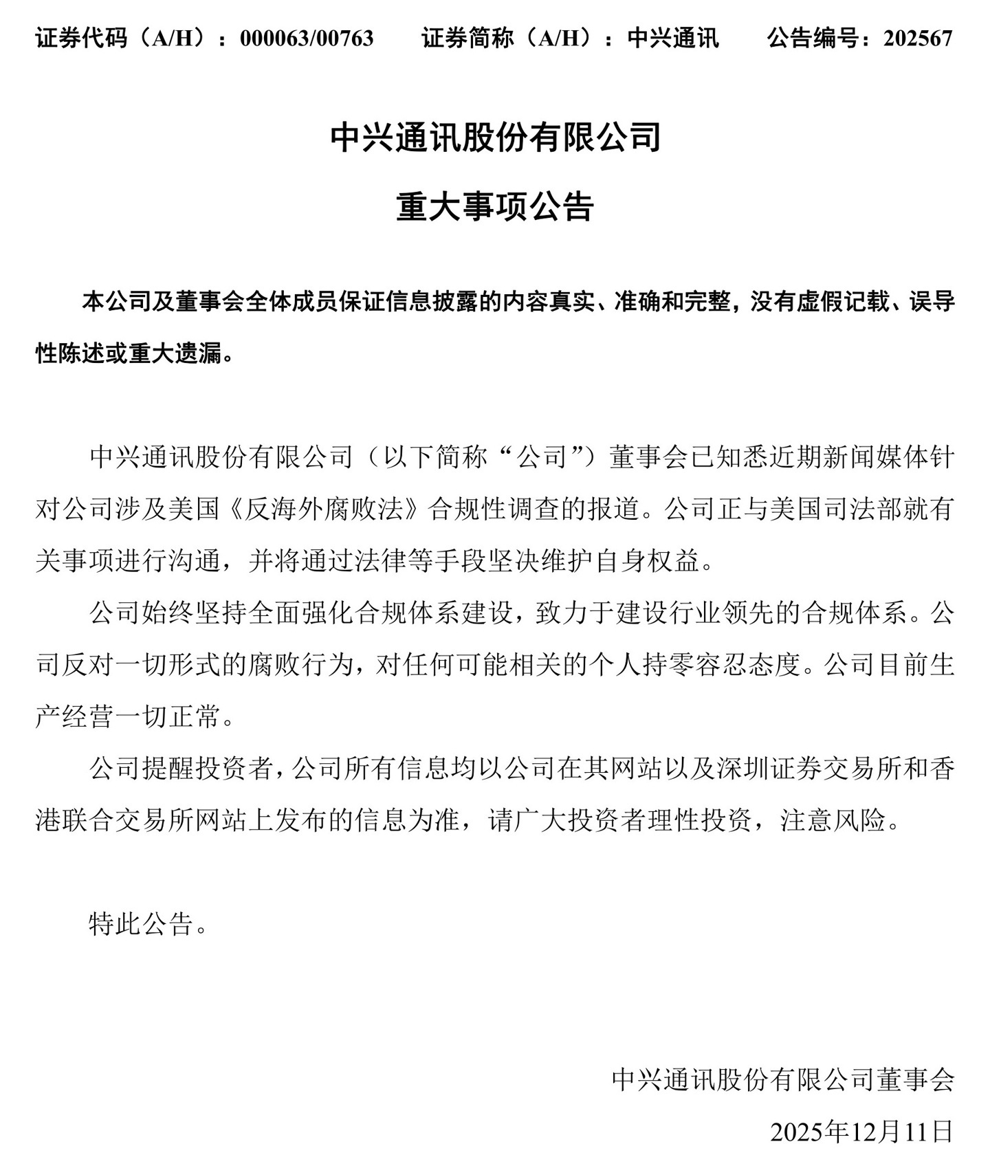 中兴:公司反对一切腐败行为,正与美国司法部就有关事项进行沟通 IT之家 12 月 11 日消息,中兴通讯股份有限公司今日发布一份重大事项公告,表示公司反对一切腐败行为,正与美国司法部就有关事项进行沟通。 公告原文如下: 中兴通讯股份有限公司(以下简称“公司”)董事会已知悉近期新闻媒体针对公司涉及美国《反海外腐败法》合规性调查的报道。公司正与美国司法部就有关事项进行沟通,并将通过法律等手段坚决维护自身权益。 公司始终坚持全面强化合规体系建设,致力于建设行业领先的合规体系。公司反对一切形式的腐败行为,对任何可能相关的个人持零容忍态度。公司目前生产经营一切正常。 Published by 风君子 独自遨游何稽首 揭天掀地慰生平 View all posts by 风君子