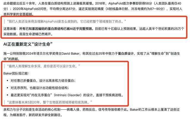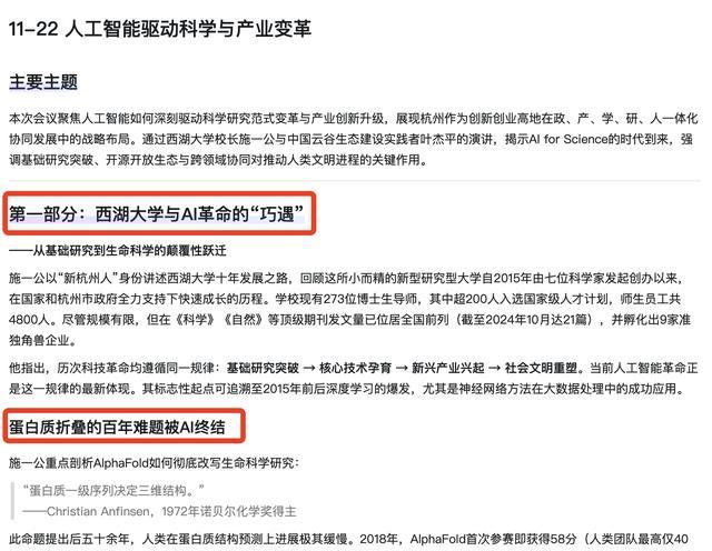 纪要在内容上通过“核心观点+演讲者金句”的方式浓缩了原演讲内容的精华,在最后AI还生成了“如果错过这个演讲将错过什么”,可以用来大大吸引了读者阅读兴趣。尽管做了“生动化”处理,内容生成的准确性依然没有打折扣,尤其体现在专有名词的准确表达,比如“诺贝尔化学奖得主David Baker”等专有名词都翻译准确,“内在无序蛋白(Intrinsic Disoder)”等专业名词也做了中英文标注。