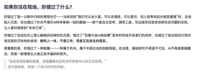 如下图所示,从几个小标题能看出AI对这段演讲的理解非常深入,生成的纪要能提炼核心观点、串联金句,并自动添加吸引阅读的结尾段落,可读性较强,适用于快速产出会议简报或媒体素材。
