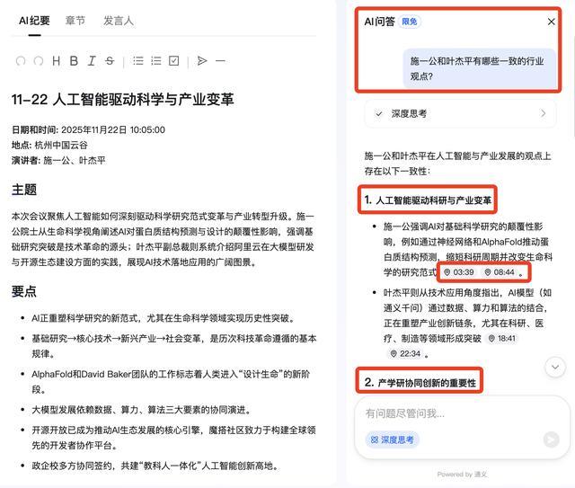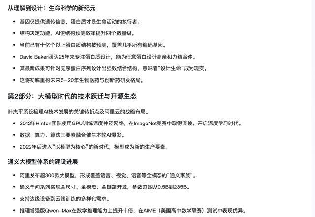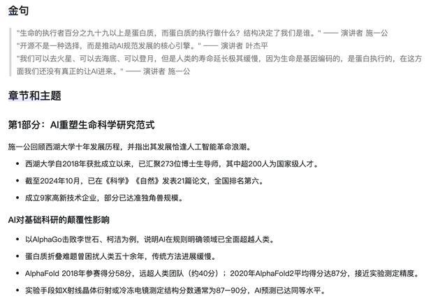 虽然在基本转写中其对专业名词有一些误读,但其在总结中借助大模型纠正了这些错误,比如其对AlphaFold、魔搭社区、施一公等专有名词及人名都能够进行准确的转译,且整体行文的逻辑连贯度较强。