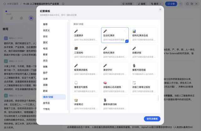 还有很多AI场景化模版,可以支持用户在开会、采访、心理咨询、法律咨询、客户拜访、面试问答等工作场合,对语音沟通进行总结分析划重点,需要大家在不断尝试中发现实际价值。