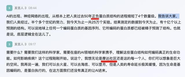 当我的手机上的钉钉App自动同步了DingTalk A1记录的演讲内容,如下图所示,在一段关于“AI+生命科学”的演讲中,DingTalk A1对大段内容都实现了准确转写,语句连贯性较好,标点符号使用合理。但其也存在一些识别错误,比如将“征服”识别为了“正负”,将“魔搭社区”识别为了“摩达社区”,但简单校对即可纠正。