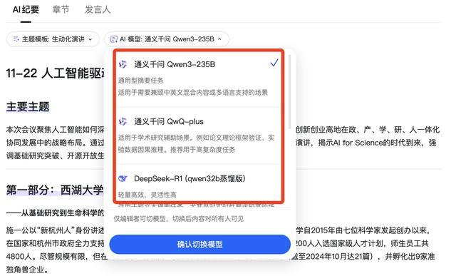 上述转写和总结主要基于通义千问Qwen3模型实现,但DingTalk A1的“AI听记”还支持多个模型切换,包括通义千问Qwen3-235B、通义千问QwQ-plus、DeepSeek-R1(qwen32b蒸馏版)、DeepSeek-R1(671B满血版)、DeepSeek-V3(671B满血版)等都可以使用。