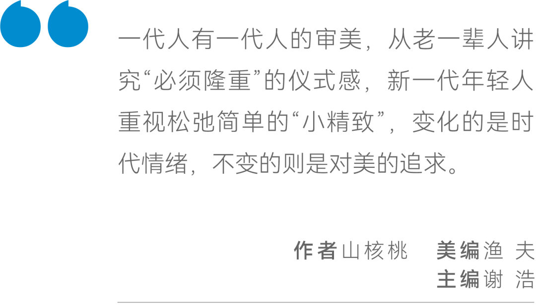 一代人有一代人的审美,从老一辈人讲究“必须隆重”的仪式感,新一代年轻人重视松弛简单的“小精致”,变化的是时代情绪,不变的则是对美的追求。