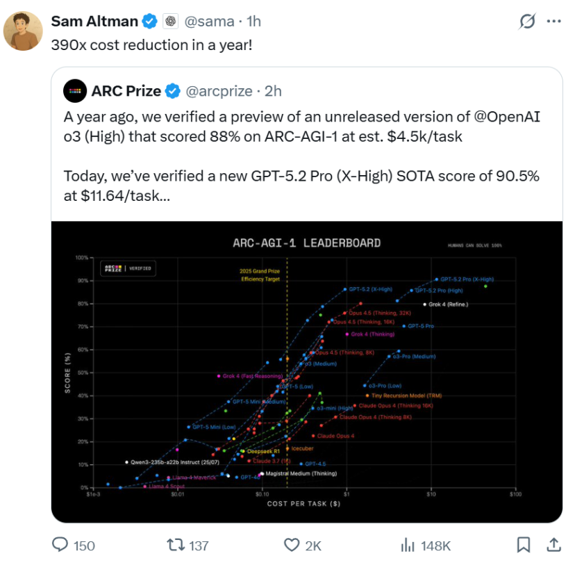 同时这次发布最引人注目的,不仅是模型本身的能力提升,更是一个令人惊讶的效率数据:在ARC–AGI-1测试中,GPT-5.2 Pro实现了约390倍的效率改进。