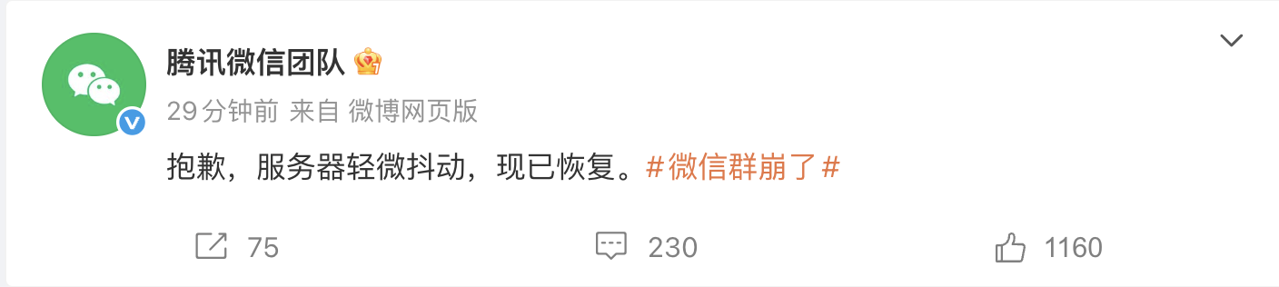 微信团队回应崩了:服务器轻微抖动,已恢复 凤凰网科技讯 12月12日,“微信群崩了”登上微博热搜。下午,大量用户反映微信群消息无法发送或同步,有网友表示,“以为自己被世界孤立了。” 之后,腾讯微信团队发布公告称,“抱歉,服务器轻微抖动,现已恢复。” Published by 风君子 独自遨游何稽首 揭天掀地慰生平 View all posts by 风君子