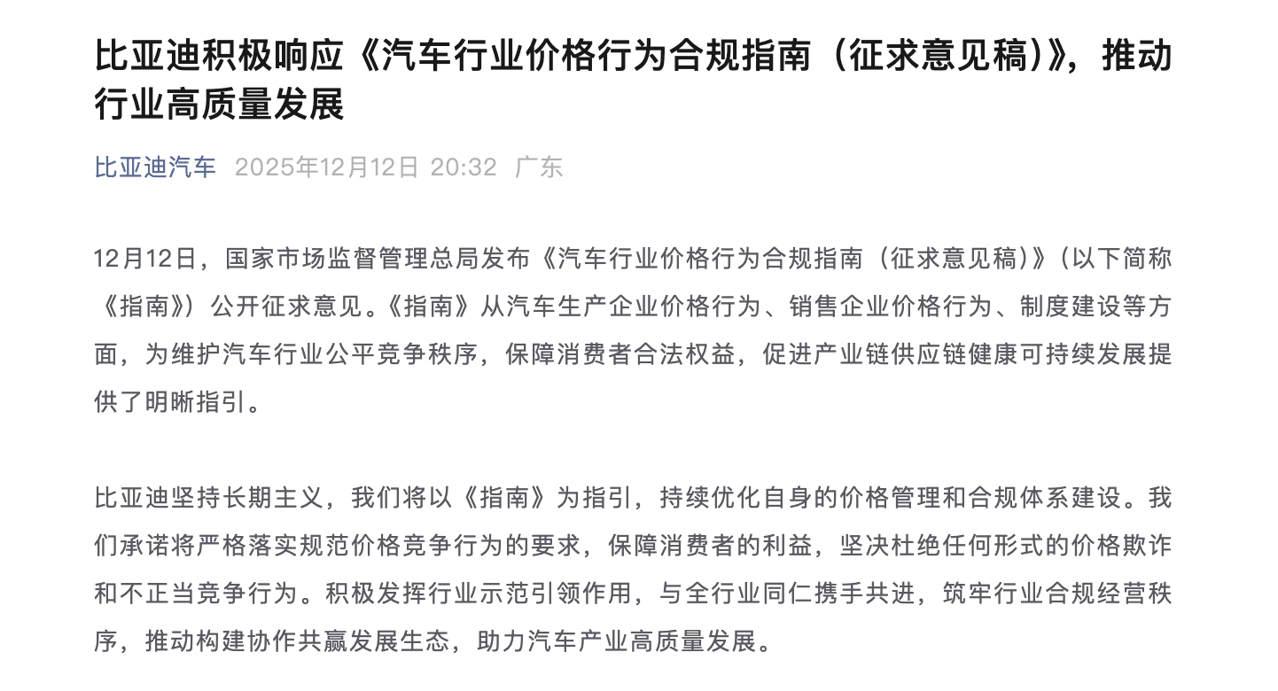 比亚迪:持续优化自身价格管理 坚决杜绝任何形式不正当竞争行为 凤凰网科技讯 12月12日,国家市场监督管理总局发布《汽车行业价格行为合规指南(征求意见稿)》(以下简称《指南》)公开征求意见。《指南》从汽车生产企业价格行为、销售企业价格行为、制度建设等方面,为维护汽车行业公平竞争秩序,保障消费者合法权益,促进产业链供应链健康可持续发展提供了明晰指引。 比亚迪表示,将以《指南》为指引,持续优化自身的价格管理和合规体系建设。我们承诺将严格落实规范价格竞争行为的要求,保障消费者的利益,坚决杜绝任何形式的价格欺诈和不正当竞争行为。 Published by 风君子 独自遨游何稽首 揭天掀地慰生平 View all posts by 风君子