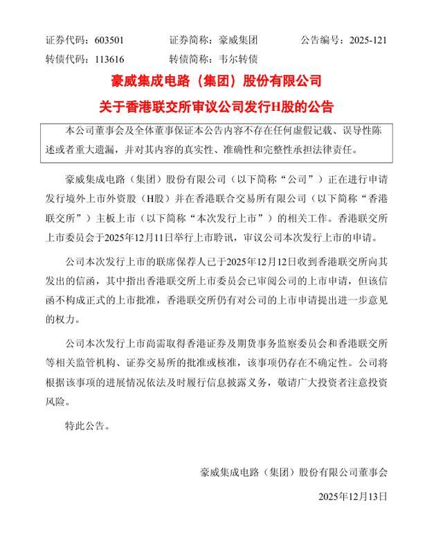 IT之家 12 月 12 日消息,豪威集团今日公告,公司正在进行申请发行境外上市外资股(H 股)并在香港联交所主板上市的相关工作。香港联交所上市委员会于 2025 年 12 月 11 日举行上市聆讯,审议公司本次发行上市的申请。