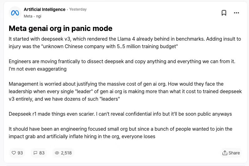 当时,社交网络上流传出一份内部信显示,Meta 的生成式 AI 团队陷入了恐慌状态。“一切始于 DeepSeek V3,它让 Llama 4 在基准测试中落后。”“工程师们正疯狂地剖析 DeepSeek,复制一切能复制的东西。”