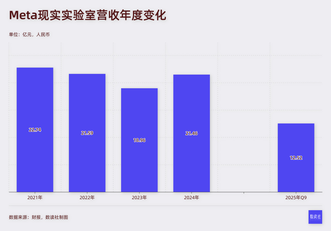 2025年前三季度,现实实验室营收12.52亿,还不如2022年同期。2021年将这个业务单独列出时,Meta可能没想到,这一年就是巅峰,此后一直处于原地踏步,甚至倒退。