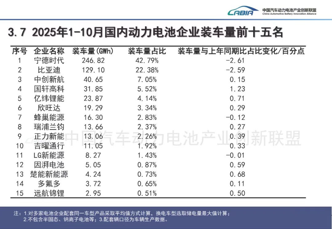 根据中国汽车动力电池产业创新联盟数据,今年1-10月,宁德时代动力电池装车量达246.82GWh,装车量占比为42.79%,较去年同期下降2.61个百分点。