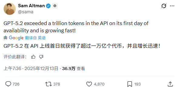 今日,OpenAI 首席执行官萨姆・奥尔特曼(Sam Altman)在 X 上宣布:“GPT-5.2 在上线首日就通过 API 实现了超万亿 Tokens 调用,并且增长迅速!”