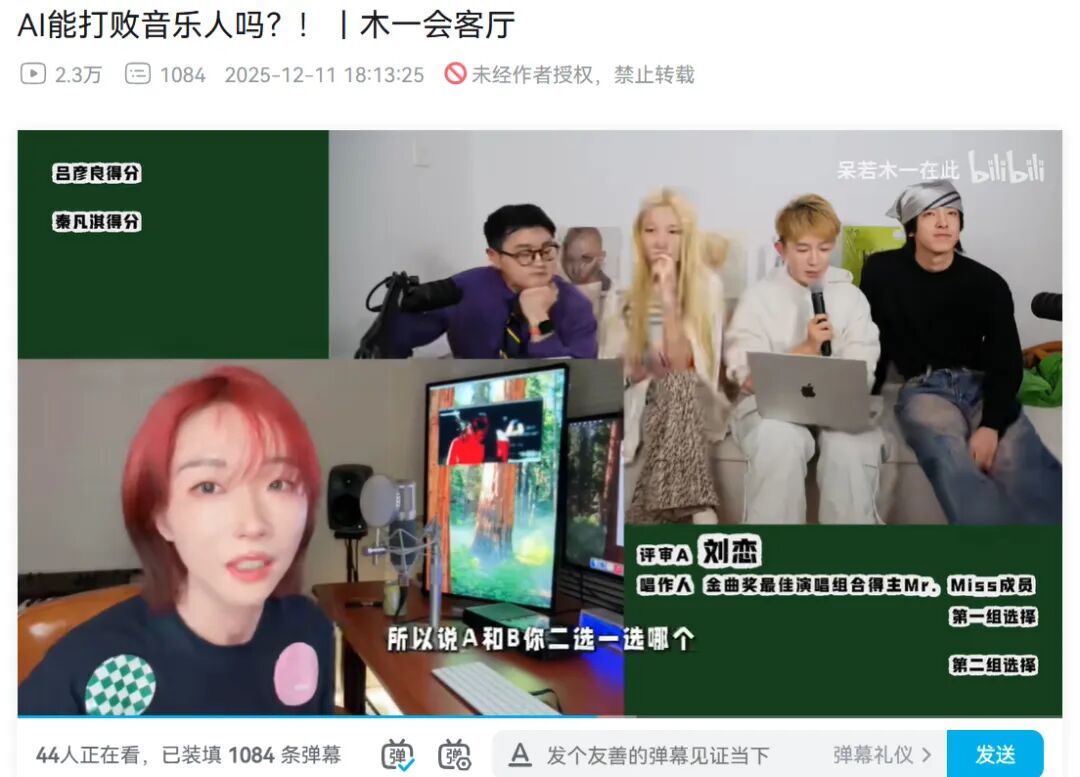 比如B站音乐博主“呆若木一在此”发布了“AI能打败音乐人吗”视频,请来新生代歌手吕彦良、秦凡淇试听AI改编他们的原创曲目,还请来歌手刘恋等音乐人参与对不同版本编曲的盲选,其中几位评委直接将票投给了AI编曲。视频中,曾获台湾金曲奖最佳新人奖提名的吕彦良感慨,AI音乐创作能力超过了99%的人,甚至大部分音乐从业者的水平都不如AI。