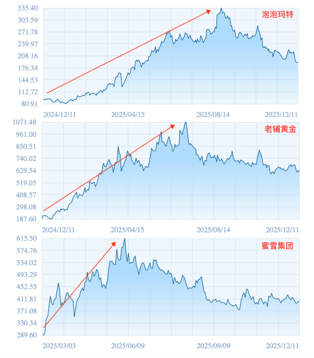 但今年,消费投资似乎有所回暖,甚至又开始出现机构抢项目的情况。这跟当年消费遇冷的节奏太像了:二级市场反向传导——2025年,“港股三姐妹”(蜜雪冰城、泡泡玛特、老铺黄金)的表现可圈可点,三家公司的总市值一度超7000亿港元,带动港股消费板块整体上行。同时还有沪上阿姨、古茗、布鲁可、霸王茶姬等明星公司成功IPO,让不少投资人大获丰收。