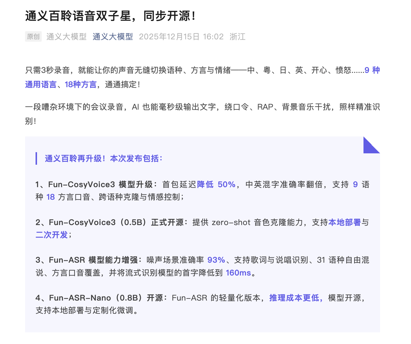 阿里通义开源Fun-CosyVoice3-0.5B 提供零样本音色克隆能力 凤凰网科技讯 12月15日,阿里通义宣布开源Fun-CosyVoice3-0.5B,该版本提供了zero-shot(注:零样本)音色克隆能力,只需要你提供一段3秒以上的参考音频,即可复刻其音色并合成新语音,并且支持本地部署和二次开发。 此外,通义推出轻量化版本Fun-ASR-Nano模型,总参数量压缩到0.8B,推理成本更低,现已开源,支持本地部署与定制化微调。 值得一提的是,通义还增强了Fun-ASR模型,噪声场景准确率93%、支持歌词与说唱识别。 Published by 风君子 独自遨游何稽首 揭天掀地慰生平 View all posts by 风君子