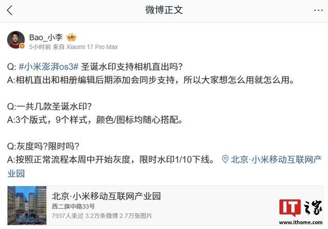 小米澎湃OS 3圣诞水印本周中开始灰度推送:3个版式、9个样式 IT之家 12 月 15 日消息,小米相机部的产品经理 @Bao_小李 今日宣布,将在澎湃 OS 3 系统推出圣诞水印,本周中开始灰度,共 3 个版式、9 个样式,支持颜色 / 图标均随心搭配、并同步支持相机直出和相册编辑后期添加。 IT之家注意到,小米相机部的产品经理 @Bao_小李 还公布了澎湃 OS 3 的圣诞水印样式,具体如下: Published by 风君子 独自遨游何稽首 揭天掀地慰生平 View all posts by 风君子
