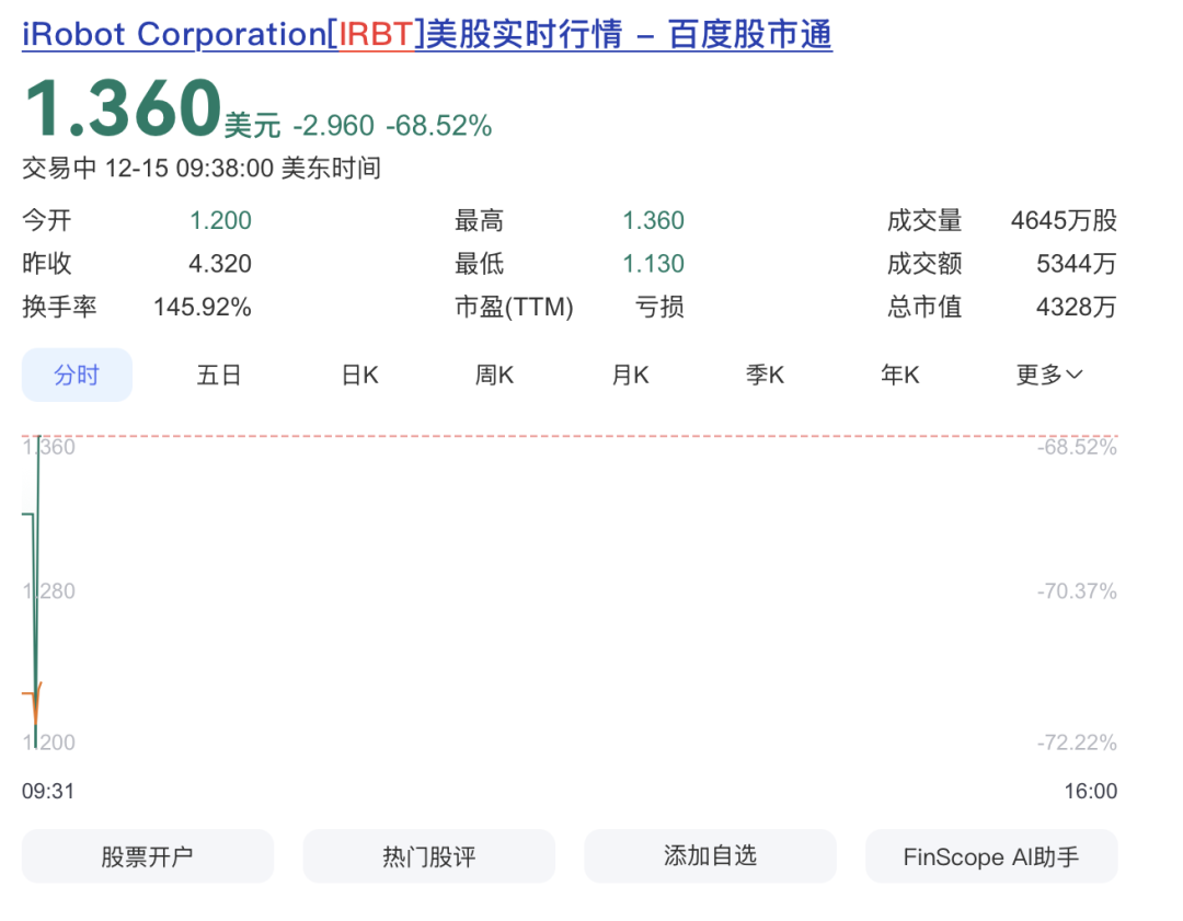 公司周一(12月15日)开盘后大幅下跌,截至发稿,iRobot Corporation(IRBT)触发临时停牌,暂停交易前下跌近69%。