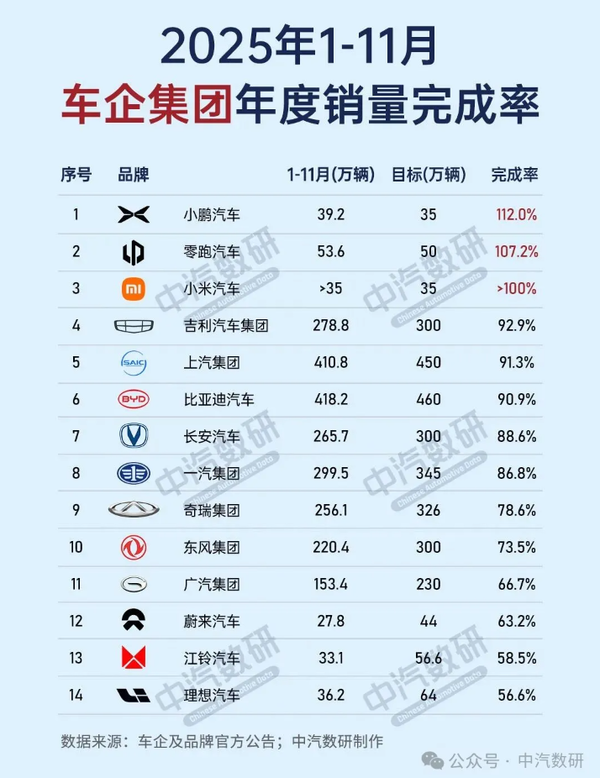 【CNMO科技消息】近日,中国主要汽车集团年度销量目标完成情况陆续公布。根据中汽数研整理的数据显示,在已披露数据的车企中,仅有小鹏汽车、零跑汽车和小米汽车三家企业实现年度目标完成率超过100%,其余多数品牌仍处于追赶阶段。