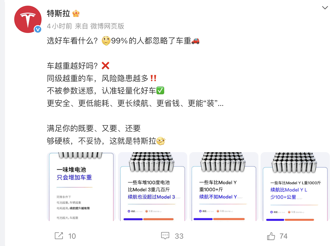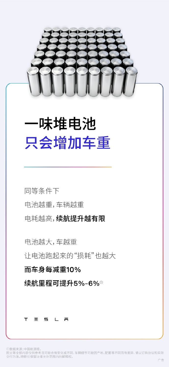 凤凰网科技讯 12月15日,特斯拉发文疑似“暗讽”竞品“堆大电池”的做法。特斯拉称,轻量化是百年汽车工业中所有工程师的努力和追求,电动车时代,动辄上百度的电池板、再加上“冰箱彩电大沙发”,让轻变成了奢侈,因为减少每一公斤,都是对安全和效率的追求。