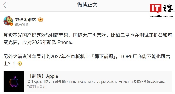 IT之家 12 月 16 日消息,博主 @数码闲聊站 今日发文表示,不光国产屏喜欢 " 对标 " 苹果,国际大厂也喜欢,比如三星也在测试阔折叠和可变光圈,应对 2026 年新款 iPhone。