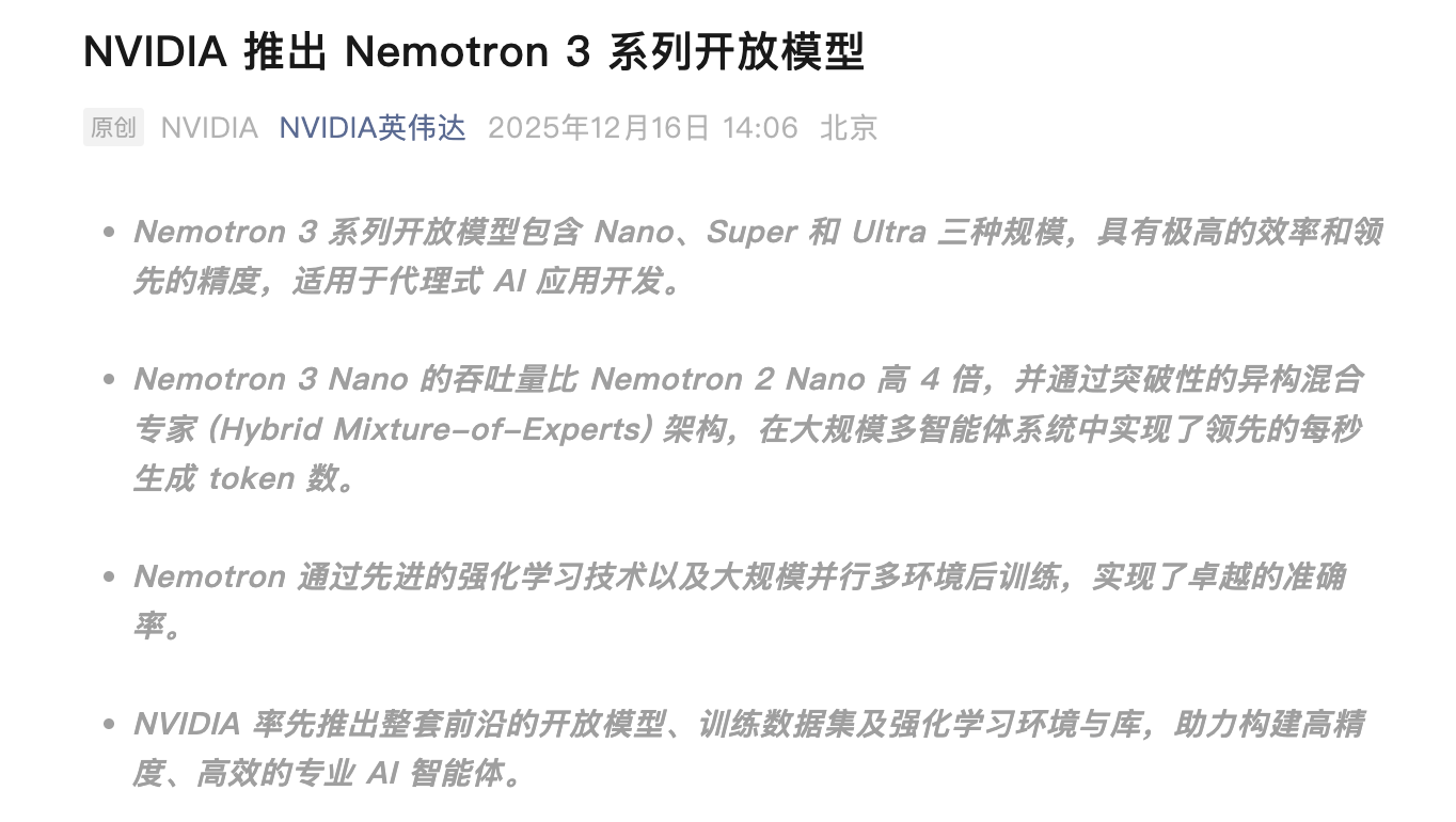 英伟达创始人兼首席执行官黄仁勋在发布中表示,开放创新是人工智能进步的基础,Nemotron系列旨在将先进AI转化为开放平台,为开发者构建大规模代理系统提供支持。