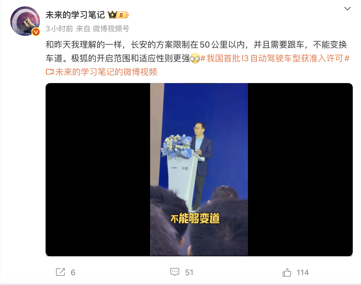 今日,汽车博主“未来的学习笔记”分享了一段华为智能汽车解决方案BU CEO靳玉志的发言视频,他在视频中介绍了两款L3级自动驾驶车辆的差异。