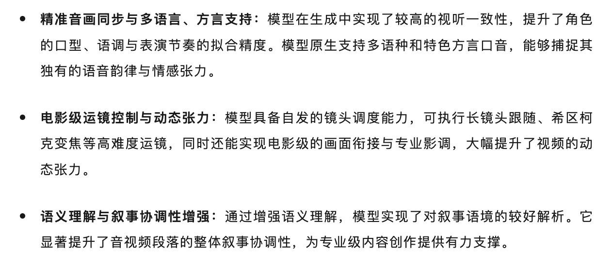 技术层面,该模型采用了基于MMDiT架构的音视频联合生成框架,并通过多阶段数据链路与强化学习方式进行优化。团队表示,其已在影视创作、广告制作、短剧及游戏内容等场景中进行测试,生成内容在指令遵循、音质表现等方面有所提升,但在复杂运动的物理稳定性、多角色对话等方面仍有改进空间。