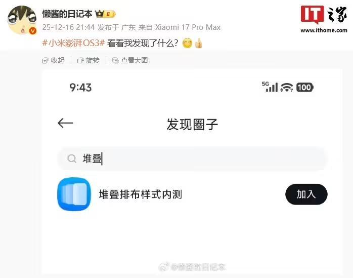 IT之家 12 月 17 日消息,据博主 @懒酱的日记本 昨日分享,小米社区已出现后台叠堆排布样式内测活动,博主所加话题表明,该活动将支持升级至澎湃 HyperOS 3 的机型参加。