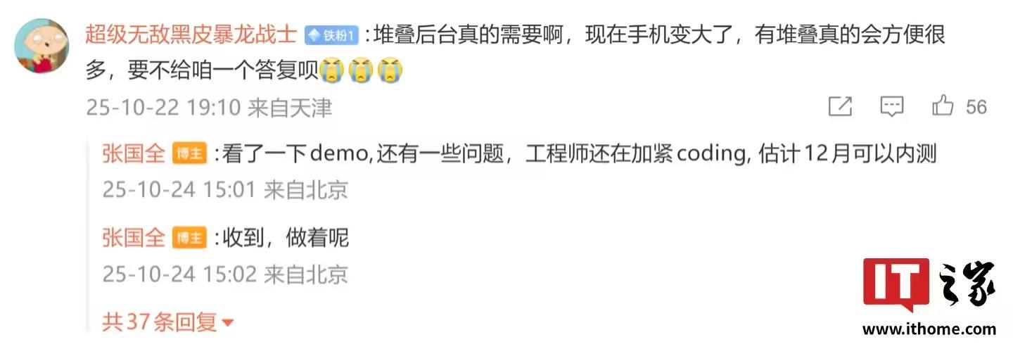 值得一提的是,小米手机系统软件部总监张国全在今年 10 月 24 日与网友互动时透露,澎湃 OS 系统的堆叠后台界面预计 12 月开启内测。