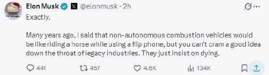马斯克回应称:“完全正确。多年前,我就说过,非自主内燃机汽车就像一边骑马一边使用翻盖手机,但你不可能把一个好主意硬塞给传统行业。他们只是坚持去死。”