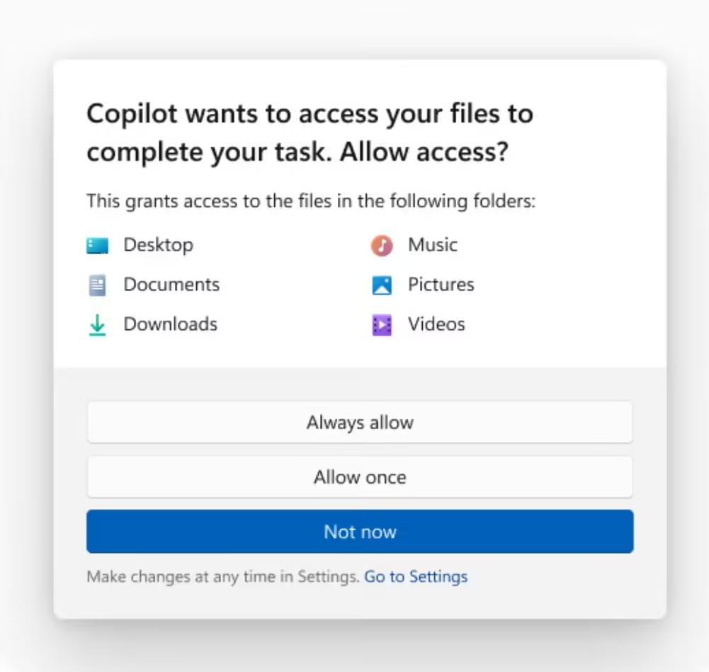 当然,用户仍可选择授权模式:允许智能体永久无限制访问、单次访问,或完全禁止访问。当 Copilot 等人工智能智能体需要访问文件以完成任务时,系统会弹出授权弹窗,提供“始终允许”“仅允许一次”和“暂不允许”三个选项。