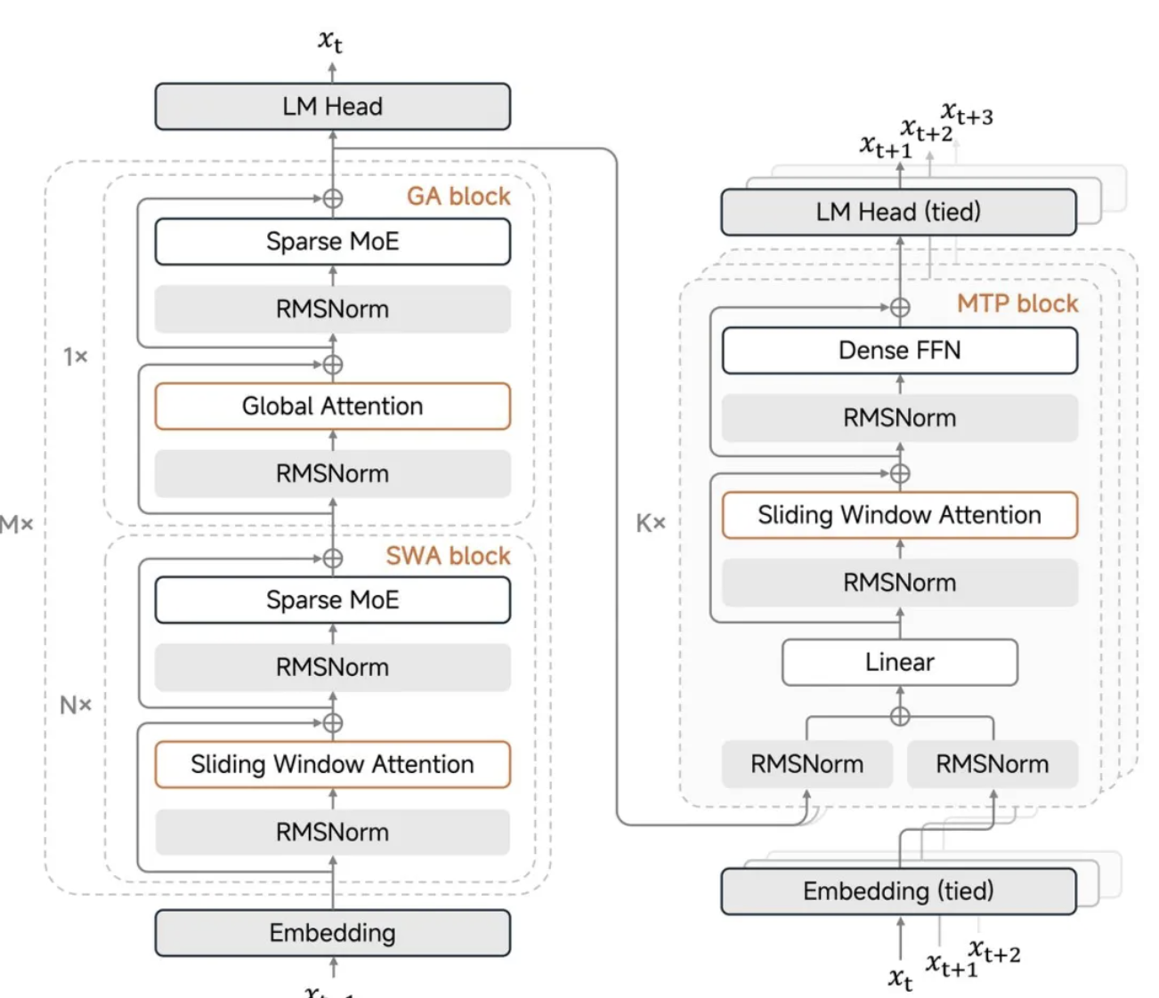 传统大模型处理长文本时,全局注意力机制会导致计算量二次爆炸,存储中间结果的 KV 缓存也跟着飙升。小米这次采用了 5 比 1 的激进比例,5 层滑动窗口注意力搭配 1 层全局注意力交替使用,滑动窗口只看 128 个 token。