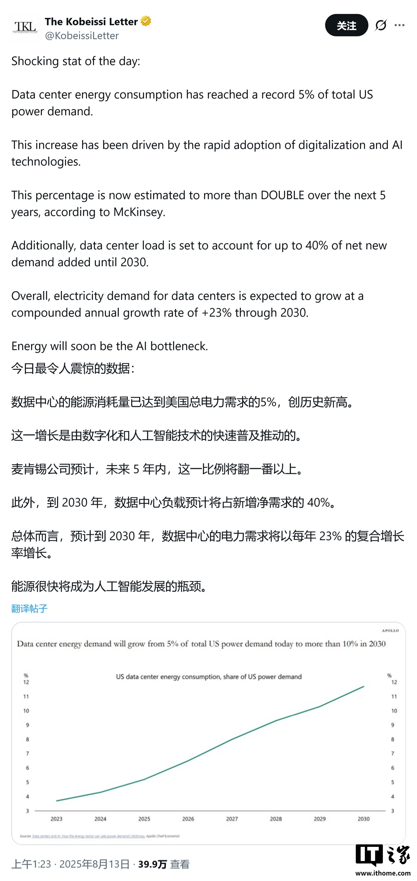 这场骂战的背景是美国日益严峻的电力供应压力。数据显示,数据中心目前已消耗了美国约 5% 的电力,且随着 AI 普及,这一比例预计将大幅攀升。
