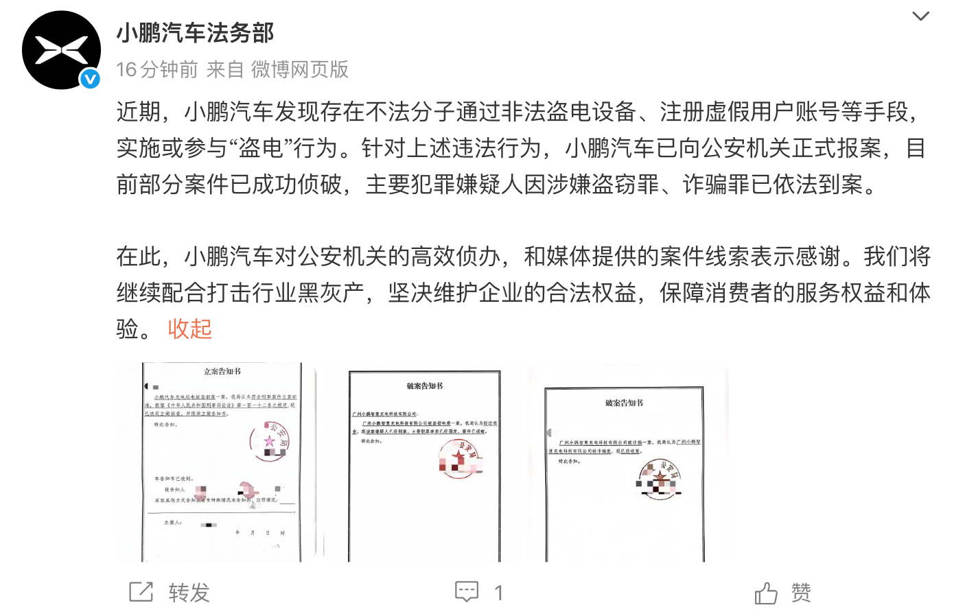 小鹏汽车法务部:公司充电站电被盗刷 部分案件已成功侦破 凤凰网科技讯 12月18日,小鹏汽车法务部发文称,近期,小鹏汽车发现存在不法分子通过非法盗电设备、注册虚假用户账号等手段,实施或参与“盗电”行为。针对上述违法行为,小鹏汽车已向公安机关正式报案,目前部分案件已成功侦破,主要犯罪嫌疑人因涉嫌盗窃罪、诈骗罪已依法到案。 公布的案件文书显示:小鹏汽车充电站电被盗刷一案,符合刑事案件立案标准。经过侦查,该案嫌疑人已经到案,主要犯罪事实已经固定,案件已侦破。 Published by 风君子 独自遨游何稽首 揭天掀地慰生平 View all posts by 风君子
