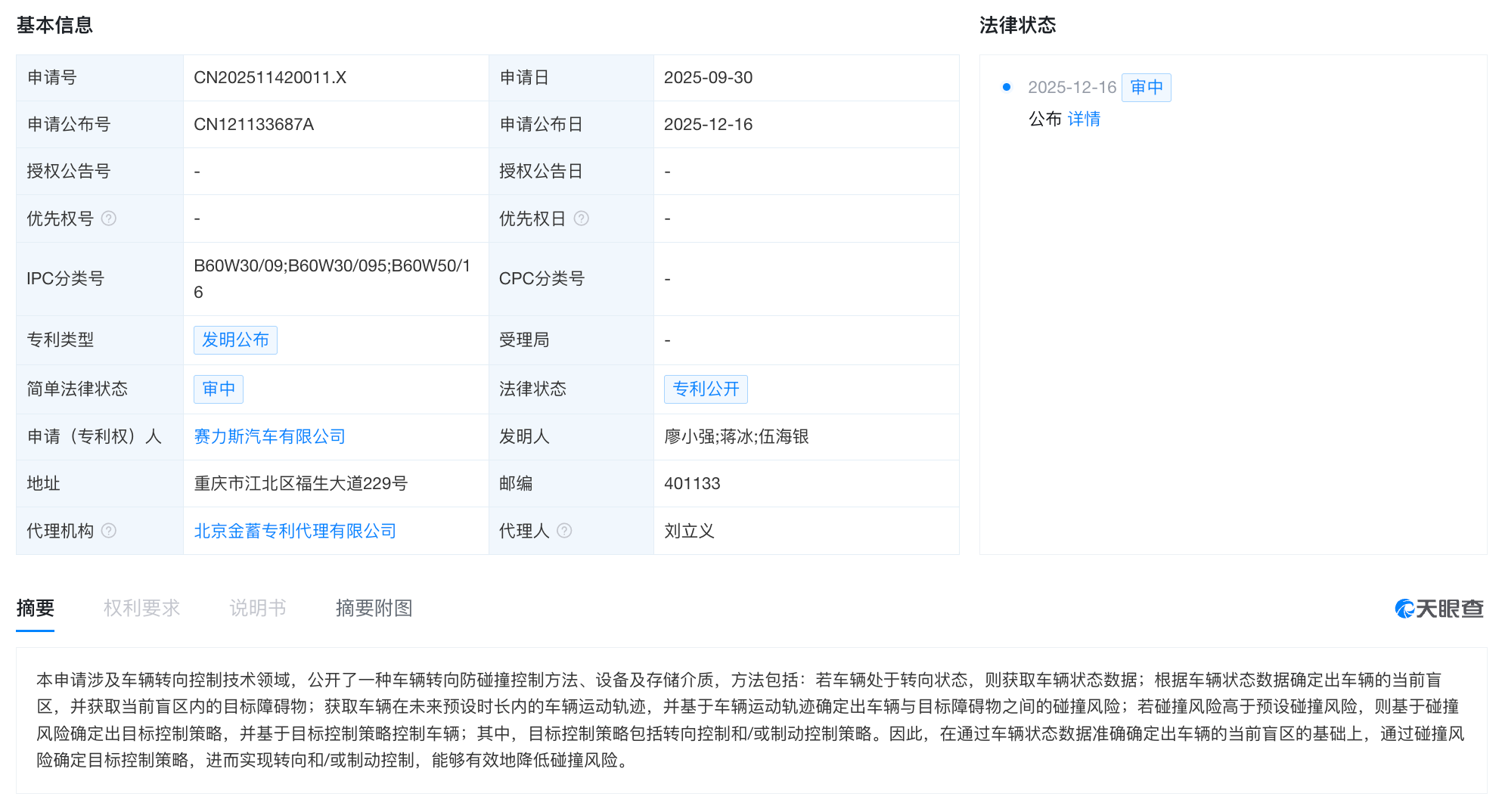 凤凰网科技讯 12月18日,天眼查显示,近日,赛力斯汽车有限公司申请的“车辆转向防碰撞控制方法、设备及存储介质”专利公布。