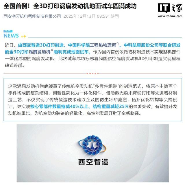 IT之家 12 月 18 日消息,据陕西日报今日报道,由中国科学院工程热物理研究所、中科航星科技股份有限公司、西安交通大学等联合研发,陕西企业西安空天机电智能制造有限公司承制的全 3D 打印涡扇发动机已完成地面试车。