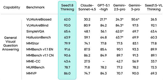 在多项公开评测中,豆包1.8展现出具有竞争力的全面表现:在视觉推理、通用视觉问答、空间理解及视频理解等任务中,均获得最佳或接近最佳成绩;在通用智能体测评集BrowserComp上表现全球领先;在数学与推理等基础能力维度上,整体水平已接近全球顶尖的通用模型。
