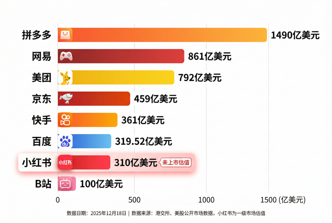 这些昂扬的数字,也给了资本信心。小红书在一级市场的估值已经超过 300 亿美元,而在一些可以代持未上市公司期权的特殊基金里,小红书的估值更是达到 500 亿美元,甚至能稳压百度、快手一头。