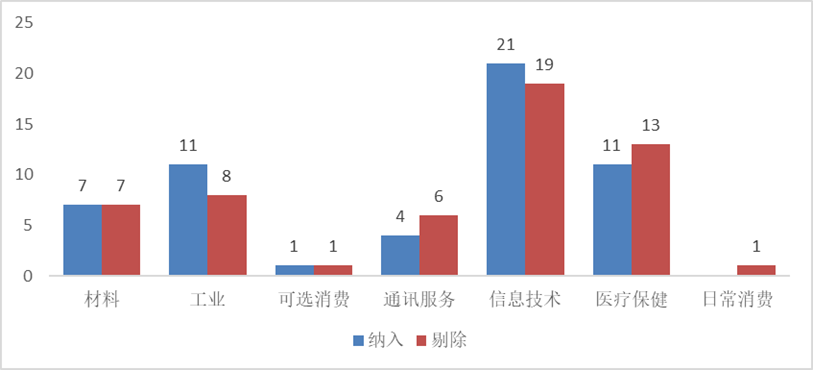 指数编制要保持一定的行业覆盖,故纳入与剔除在行业分布上亦相对均衡。其中信息技术方面纳入大于剔除,医疗保健方面剔除大于纳入,一定程度上反映市场的变化。