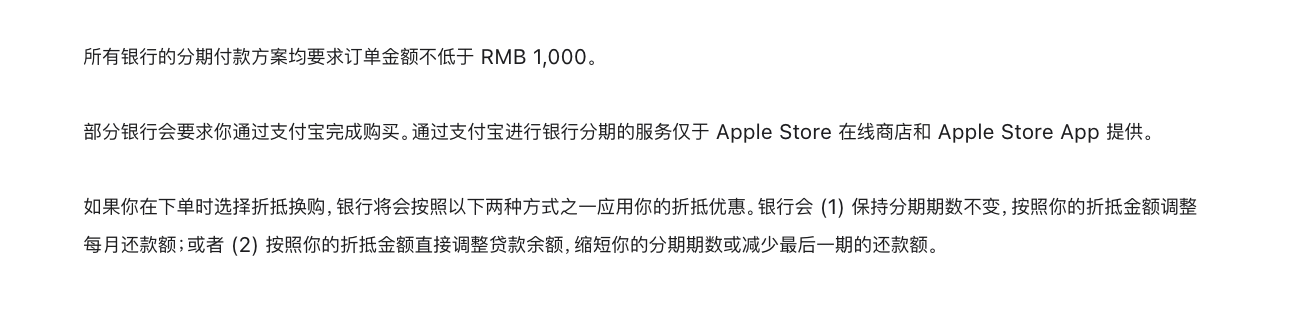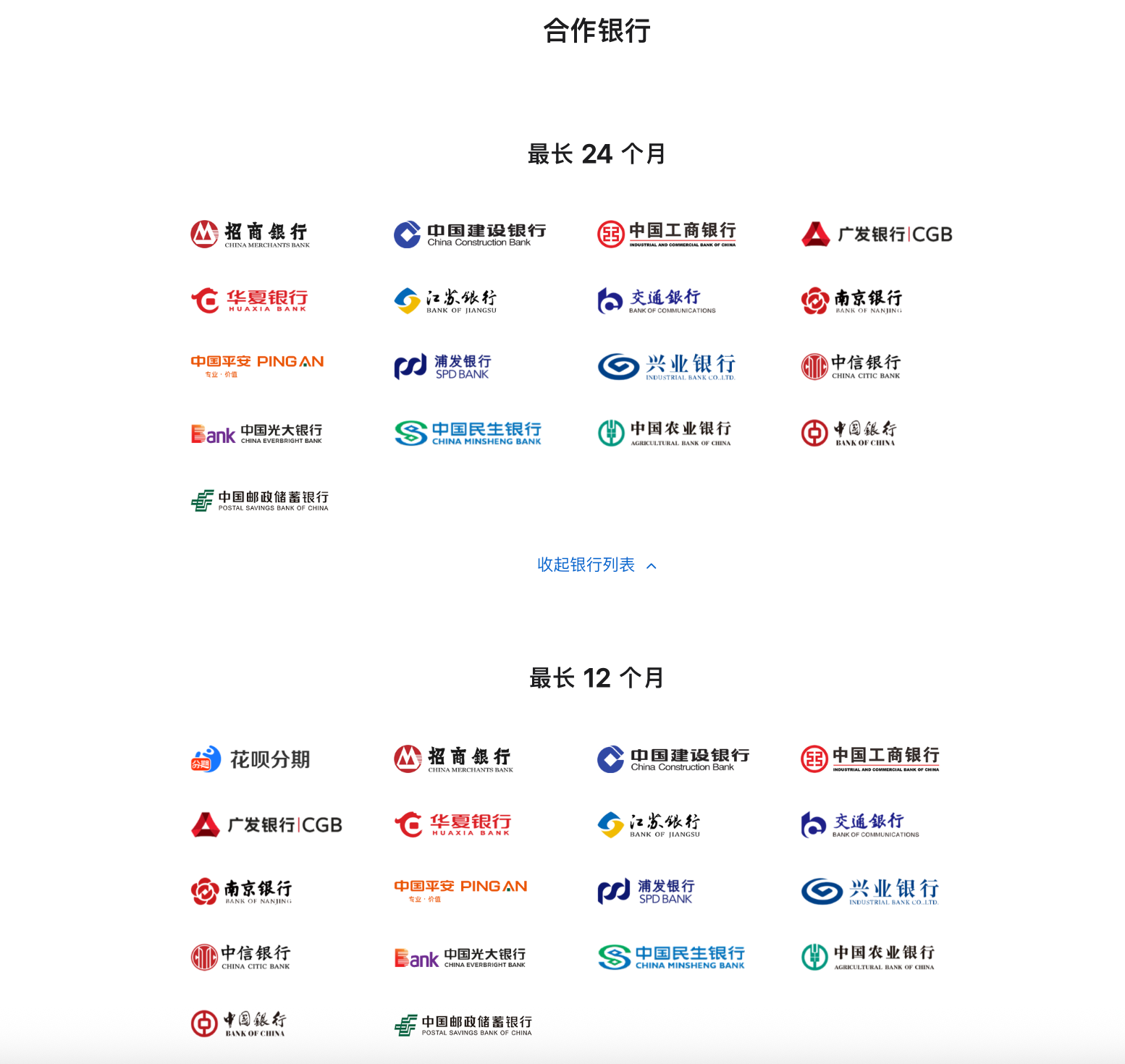 苹果官网免息分期新增14家银行、农行、交行、广发等 凤凰网科技讯 12月19日,苹果官网和Apple Store App免息分期付款选项更新,扩充可用银行数,涵盖中行、农行、交行、广发、中信银行等。此前苹果官网和Apple Store App只支持花呗、招行、工行、建行免息分期付款。 需要注意的是,所有银行的免息分期付款方案均要求订单金额不低于1000元人民币,部分银行需要通过支付宝完成购买,购买人需要拥有对应银行的信用卡才能使用免息分期付款功能。 Published by 风君子 独自遨游何稽首 揭天掀地慰生平 View all posts by 风君子