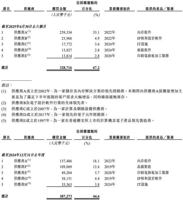 天数智芯的主要供应商主要包括内存组件、晶圆制造、印刷电路板加工服务、IP核及设计软件的供应商。