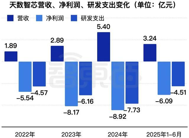 2022年、2023年、2024年、2025年1-6月,天数智芯收入分别为1.89亿元、2.89亿元、5.40亿元、3.24亿元,净利润分别为-5.54亿元、-8.17亿元、-8.92亿元、-6.09亿元,研发费用分别为4.57亿元、6.16亿元、7.73亿元、4.51亿元。