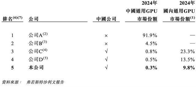 根据弗若斯特沙利文报告,2024年,按收入计,包括天数智芯在内的三家中国公司已跻身中国通用GPU市场五大参与者之列,其中天数智芯排名第5,市占率达到0.3%。